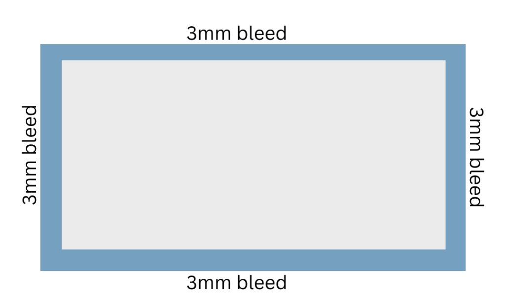 Please include a 3mm bleed on all sides of your artwork. Bleed is the extra artwork that